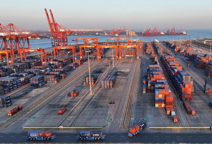 2024年11月5日拍攝的唐山港京唐港區(qū)集裝箱碼頭堆場(無人機(jī)照片)。新華社記者 楊世堯 攝