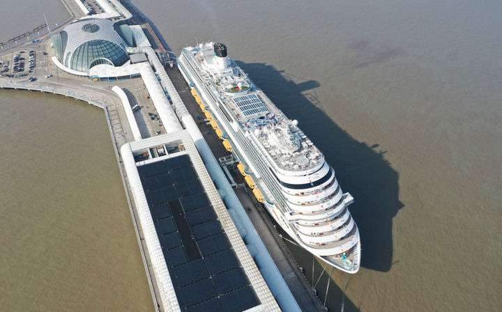 2024年1月1日,“愛達(dá)·魔都號”??吭谏虾卿量趪H郵輪港(無人機(jī)照片)。新華社記者 丁汀 攝