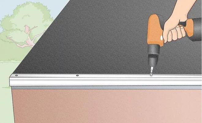 從當(dāng)?shù)氐奈褰鸬曩徺I鋁制接線條,然后將其固定在屋頂?shù)奶羁p邊緣上。使用螺釘和鉆頭將桿固定在橡塑上,間隔約2.5cm,或者固定在桿有孔的任何位置。