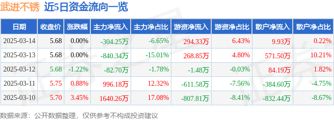 3月14日的資金流向數(shù)據(jù)方面,主力資金凈流出304.25萬元,jinnianhui金年會占總成交額6.65%,游資資金凈流入294.33萬元,占總成交額6.43%,散戶資金凈流入9.93萬元,占總成交額0.22%。