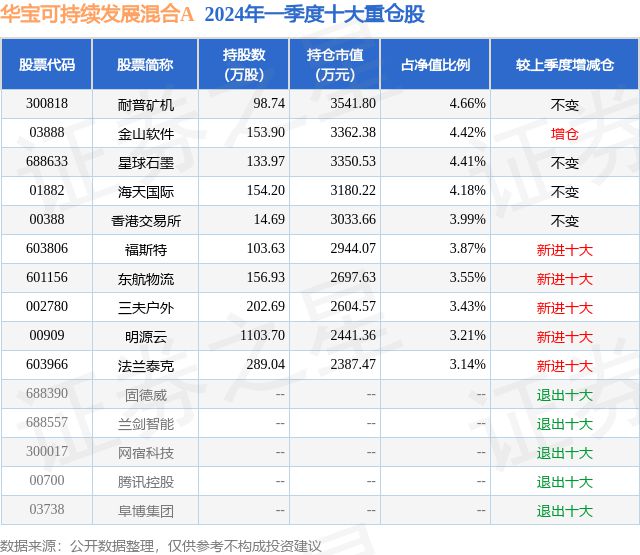 根據(jù)2024基金Q1季報公募基金重倉股數(shù)據(jù),重倉該股的公募基金共7家,金年會其中持有數(shù)量最多的公募基金為華寶可持續(xù)發(fā)展混合A。華寶可持續(xù)發(fā)展混合A目前規(guī)模為5.1億元,最新凈值0.7313(6月5日),較上一交易日下跌0.95%,近一年下跌15.53%。該公募基金現(xiàn)任基金經理為賀喆。賀喆在任的基金產品包括:華寶制造股票,管理時間為2018年8月24日至今,期間收益率為71.61%;華寶研究精選混合,管理時間為2021年12月21日至今,期間收益率為-32.76%;華寶遠景混合A,管理時間為2024年3月25日至今,期間收益率為nan%。