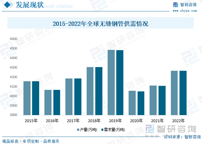 20世紀90年代國外無縫鋼管生產(chǎn)企業(yè)進入整合期,在2000年初形成了5大鋼管生產(chǎn)集團(Tenaris集團、V&M集團、TMK集團、日本住友金屬有限公司、日本JFE集團)。前幾年因為疫情的影響和經(jīng)濟下行的沖擊,行業(yè)產(chǎn)需量有所下降,2022年全球無縫鋼管產(chǎn)量為4266.8萬噸,金年會官網(wǎng)平臺需求量為4265.8萬噸。
